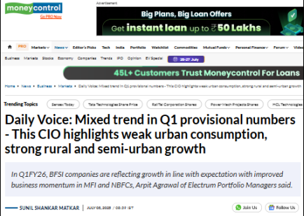 Daily Voice: Mixed trend in Q1 provisional numbers – This CIO highlights weak urban consumption, strong rural and semi-urban growth “Q1 provisional numbers have been a mixed bag, with rural and semi-urban focused businesses showing stronger growth, as reflected in the performance of tractors,” Arpit Agrawal, co-founder and CIO of Electrum Portfolio Managers, said in […]